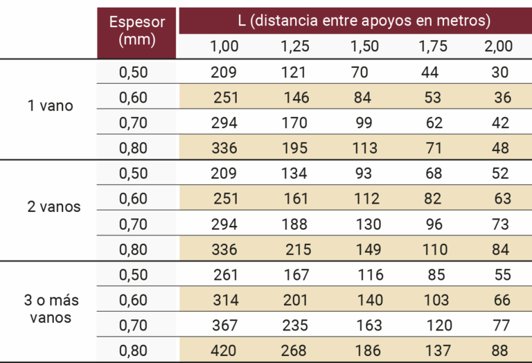 La información recogida en las tablas es orientativa, siendo el proyectista el responsable de realizar los cálculos estructurales de acuerdo con la normativa aplicable en cada país.