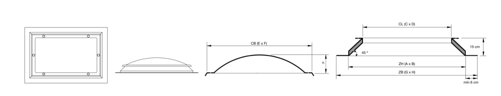 Claraboyas con base rectangular con zócalo inclinado en Castellón. Para techos de naves industriales o tejados en viviendas. Lucernarios. Translúcidos de policarbonato compacto, panel sándwich, celular y poliéster. Claraboyas. ficha técnica